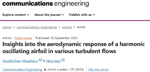 2025年9月29日,《Nature》旗下首个工程领域子刊《Communications Engineering》在线发表了土木工程学院风工程团队的最新研究成果《Insights into the aerodynamic response of a harmonic oscillating airfoil in various turbulent flows》,博士生赵勇飞为第一作者,李明水教授和杨阳老师为共同通讯作者。该研究,系统性地揭示了湍流对振荡翼型非定常气动特性的影响机理,为风能、低空经济和大跨度桥梁设计等工程领域提供了理论基础。