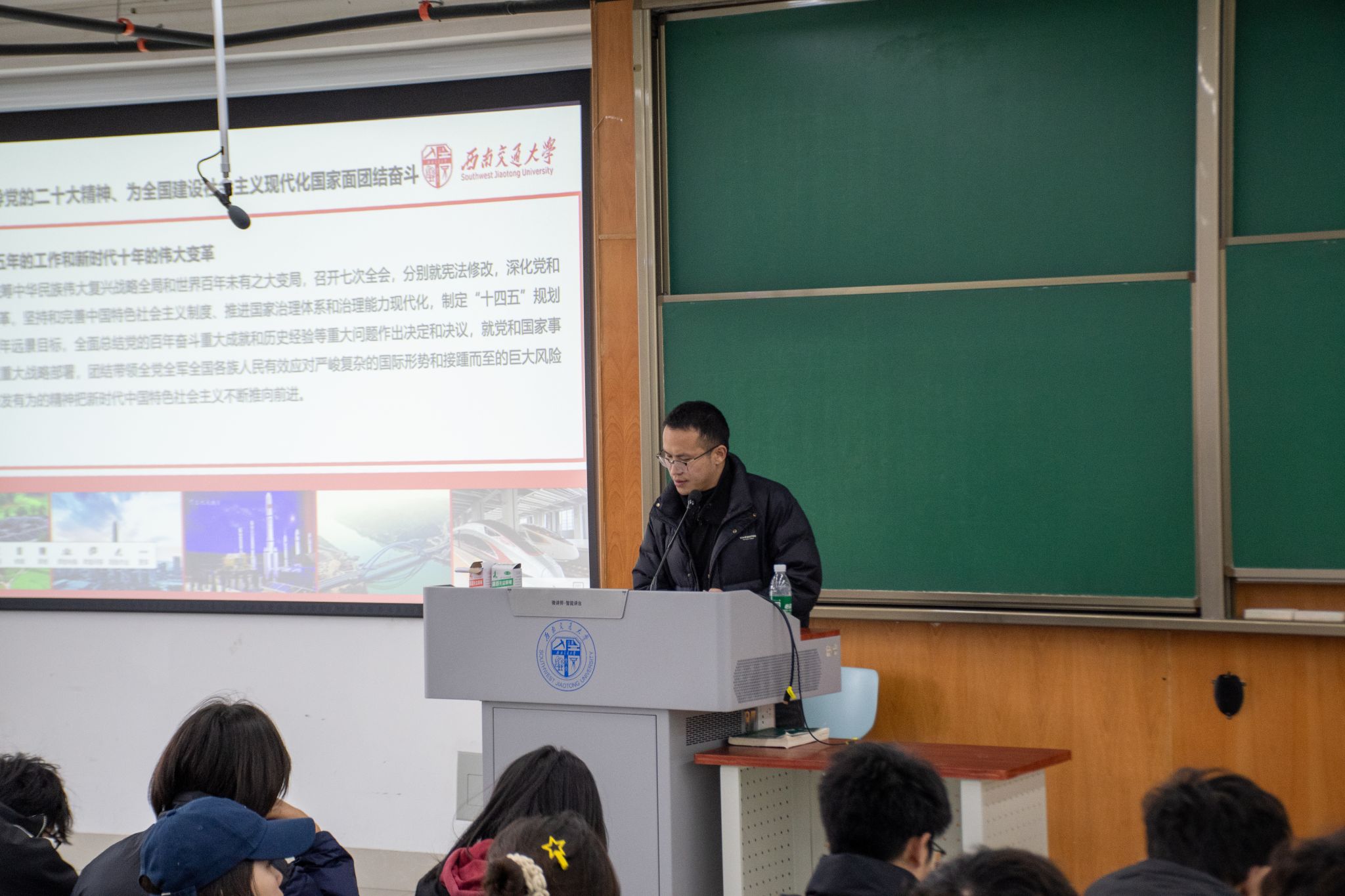 11月27日下午15:45,“党的二十大精神、习近平新时代中国特色社会主义思想学习及爱国荣校”专题教育学习,在X4359教室进行。彭政涛老师系统解读了党的二十大精神核心要义和实践要求,深入浅出地帮助学生厘清理论脉络、把握思想精髓。彭老师指出,作为新时代的大学生,大家要深刻领会党的二十大精神,将个人成长与国家发展紧密结合,为实现中华民族伟大复兴的中国梦贡献自己的力量。最后,彭老师对同学们提出殷切期望,希望大家能够珍惜这次培训机会,认真学习、积极思考、勇于实践,努力成为新时代的优秀学生干部。
