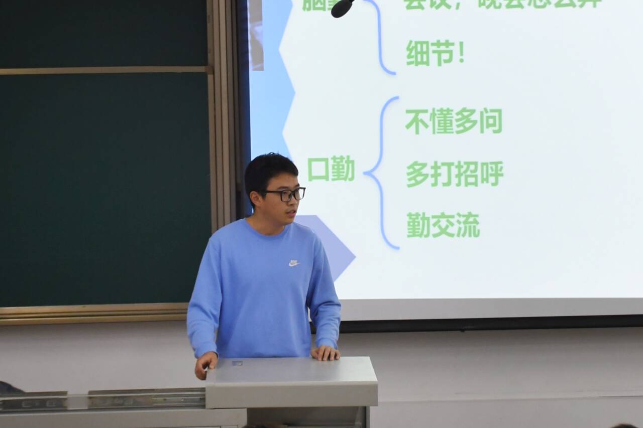 同一时间,“新生团学组织干事能力素质提升”专题培训在X2418教室开展。郭哲维老师以“从‘新’出发,卓越担当”作为主题,分享了自己从干事到干部,再到辅导员的经历,让学生深刻体会团学组织的建设力和凝聚力。接着,郭老师以“学生会报销规范”为例,强调团学组织干事需要重视细致办事能力的培养。同时,郭老师还分享了如何平衡学习与工作,面对挫折和保持热情的方法。最后,郭老师祝愿全体干事能永葆初心,用热情点燃梦想,用实干书写担当!