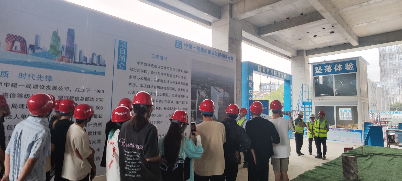 在参观过程中,中建一局发展公司的工作人员向同学们强调,现在的工地安全是前提。在项目建设过程中无不体现出中建一局发展公司对于安全管理,消防管理,质量管理,绿色建造等各方面都有着科学的技术。特别是安全管理方面,项目方方面面都考虑的非常细致完善,同学们也在工作人员的组织下进行了许多关于安全的实践体验。