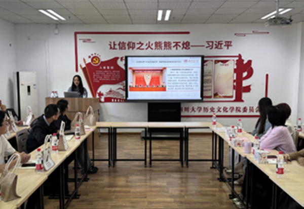 支部联建共学活动于当日下午15:00在四川大学(江安校区)历史文化学院文科楼二区六楼的党建活动室621准时开始。参与此次活动的不仅有来自西南交通大学和四川大学的优秀硕士博士党员代表,还有bat365中文官方网站的研究生辅导员郑非老师以及四川大学历史文化学院的党委副书记姜华老师、党委专职组织员石琼老师、2023级博士党支部书记胡楠芳老师等与会嘉宾。
