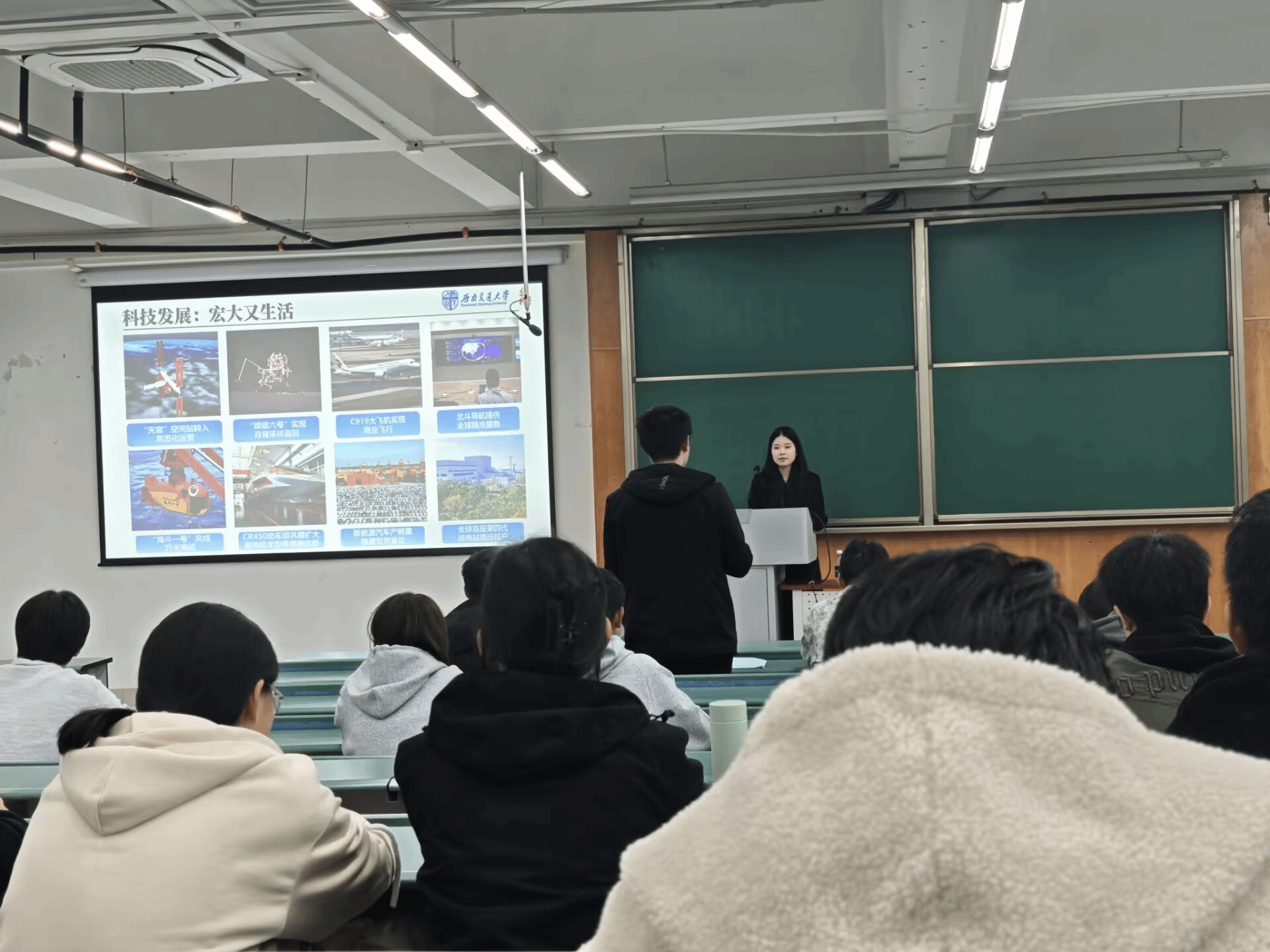 随后,高田讲师围绕“‘十四五’科技赋能,绘就发展新图景”这一核心主题,为同学们展开了深入的讲解。她首先对2025年10月党的二十届四中全会所通过“十五五”规划进行了细致的解读,阐明了规划中“以科技创新引领新质生产力”这一重要发展方向。同时,她还详细介绍了西南交通大学在轨道交通领域的深厚科研积累,生动展现了高校在川藏铁路攻坚等国家重大工程项目中所展现出的责任与担当。她还以成渝地区为例,具体讲述了近五年来成都市在构建“空中丝绸之路+国际陆海联运”双走廊方面所取得的显著成果。