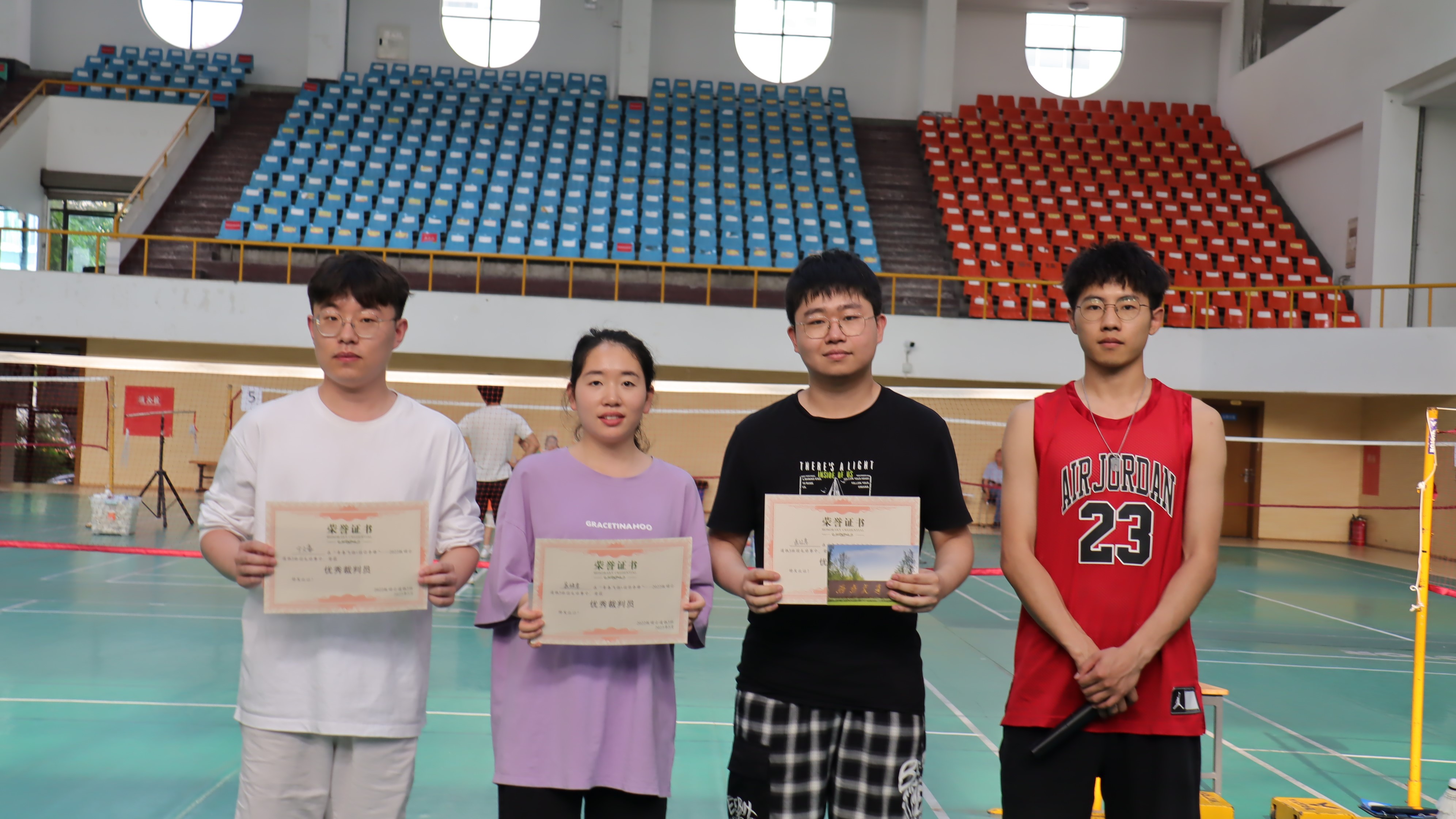 决赛赛结束后,举行了本次“青春飞扬,羽你争锋” ——2022级硕士道铁3班羽毛球赛的颁奖仪式,2022级硕士道铁3班班委向获奖选手表示了热烈祝贺, 并祝愿大家在以后的学习和生活中也再接再厉,发挥出本次比赛拼搏进取的精神,为学校争光。2022级硕士道铁3班班委分别向本次赛事的优秀裁判员宁文豪、屈姝君、岳江芃颁发了优秀裁判奖;向男双组冠军:林修全、刘光延队,亚军:张子扬、何金宏队,季军:庞晨曦、聂梓龙队颁发了奖状和奖品;向混双组冠军:江昊然、王纯队,亚军:庞晨曦、尼里阿左队,季军:欧信旺、田琳路队判罚了奖状和奖品;向参加本次比赛的其余队伍颁发了赛事参与奖。