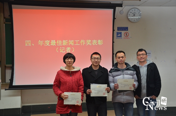 会议的最后一项议程是为优秀的新闻工作者颁奖。研究生新闻中心如同一部精密的机器,正是这些新闻工作者们,如同一个个“齿轮”,让整个组织环环相扣,有条不紊的运转。研究生新闻中心副主任王国栋对这些优秀的新闻工作者进行了表彰,对他们的辛勤工作给予了肯定。获奖名单如下: