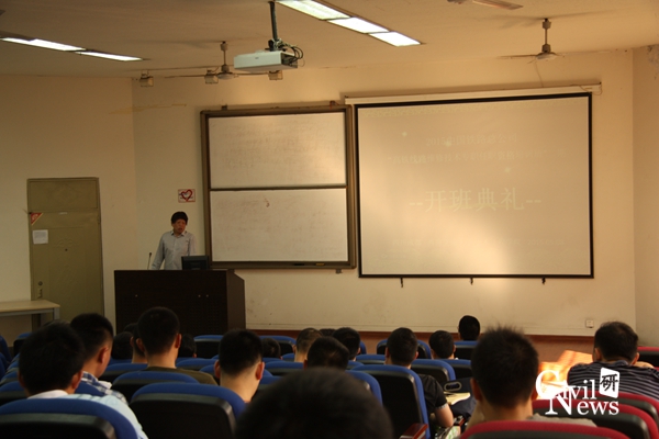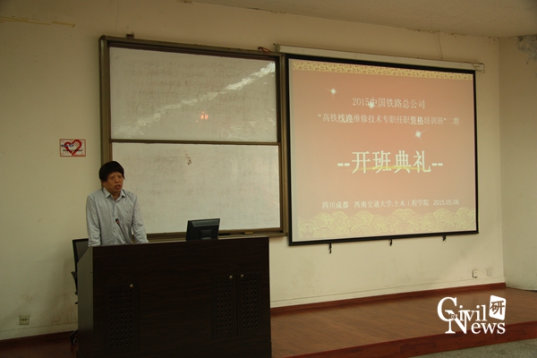 首先,江老师介绍了出席典礼的各位领导及老师,并对前来参加此次培训的各位学员表示欢迎。随后,土木工程学院副院长任宝良教授上台讲话。任副院长简要介绍了学校119年的悠久历史,并表明学校在历史发展中,铁路相关专业不断发展和壮大,逐渐形成了西南交大在铁路方面的绝对优势。任副院长表达了学院对铁路总公司此次下达的培训任务的重视,也希望各位学员,作为总公司的骨干力量,能珍惜并充分利用这次培训机会,增加自己的知识储备,提高自己的专业能力。结合当前我国高铁事业的不断发展,任副院长指出工程发展对线路维修的技术从业人员提出了新要求。他说到,培训班将采用培训与测试相结合的方式,保证培训质量,检验培训效果,希望大家认真对待培训内容,遵守考勤制度,在最后的测试环节能达到80分的合格线。最后,任副院长嘱咐大家多注意天气变化,照顾好自己的饮食起居,避免出现水土不服的现象。