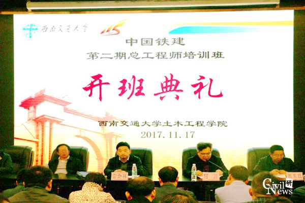 中国铁建第二期总工程师培训班开班典礼于2017年11月17日上午8点在西南交通大学远程与继续教育学院5405会议室举行。中国铁建总工程师雷升祥、西南交通大学校长助理何川教授、土木工程学院党委书记刘学毅教授、中国铁建人力资源部处长周东旺以及中国铁建各位总工程师出席了此次开班典礼。