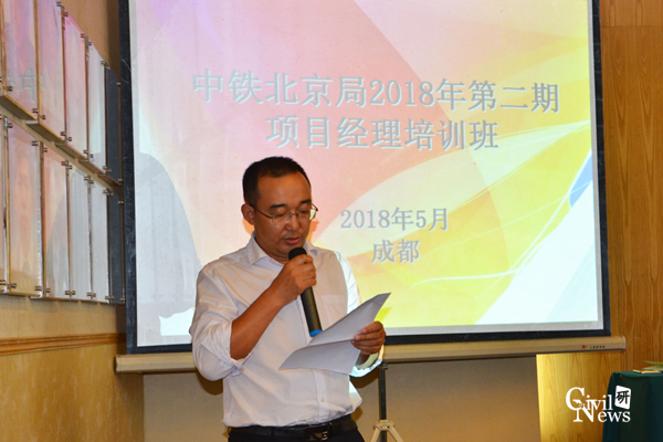 典礼开始第一项议程,我校土木工程学院院长助理占玉林老师首先致辞,并代表土木工程学院热烈欢迎中铁北京局各位领导和学员莅临我校。占玉林老师首先介绍了西南交通大学的基本情况以及一校两地三校区的办学格局,接着重点给各位项目经理介绍了土木工程学院的历史沿革以及当前的办学条件。他表示,土木工程学院是西南交通大学创一流示范性改革的重点学院以及排头兵,开办此次培训班是土木学院加强社会服务扩大学院影响力的重要举措,感谢中铁北京局对bat365中文官方网站的信任。