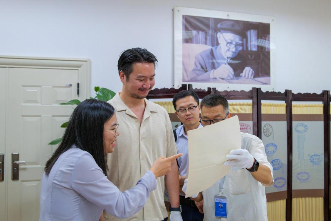 在图书馆,夫妇受到热情接待。在图书馆馆长和大使的引导下,他们重点参观了馆内珍藏的林同炎先生求学时期的宝贵史料。在古籍特藏区,他们见到了林同炎先生当年在唐山交大求学时的毕业设计手稿原件,泛黄的纸张、工整的字迹,无声诉说着青年林同炎严谨治学的态度和在工程领域展现的非凡天赋。这些珍贵档案是我校“严谨治学、严格要求”双严传统的生动写照,也让夫妇二人得以近距离触摸祖父的青春岁月与学术起点。