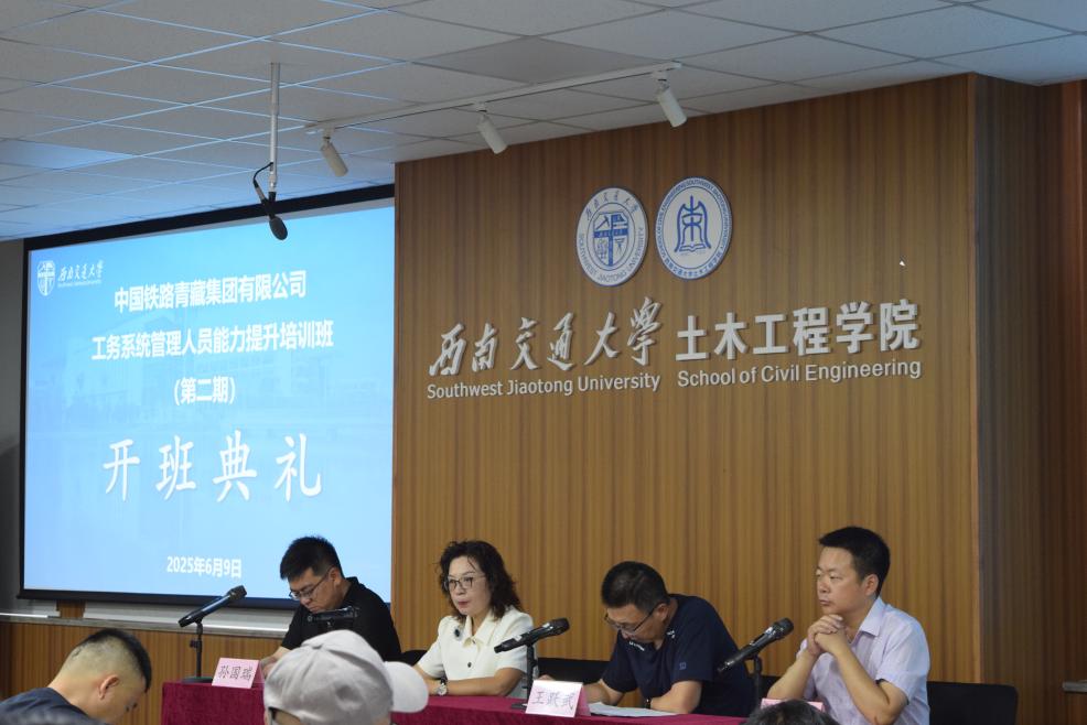 6月9日上午,中国铁路青藏集团有限公司工务系统管理人员能力提升培训班(第二期)开班典礼在土木馆1234教室举行。土木工程学院党委书记郑江、中国铁路青藏集团有限公司工务部副主任王跃武出席典礼。典礼由土木工程学院知识更新教育中心主任张迅主持。